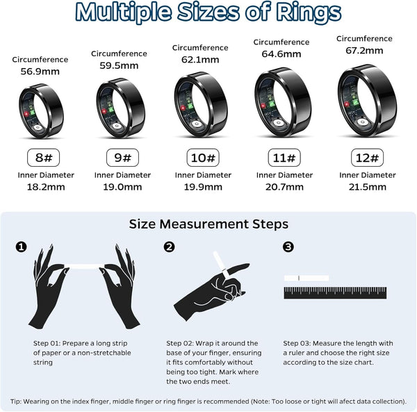 Smart Ring Health Tracker, Sleep Tracker Ring with Heart Rate, Waterproof Fitness Ring for Activity Monitoring/Steps/Distance/Calories, Air Gestures, up to 7-Day Battery, for Ios Android (Black,#10)